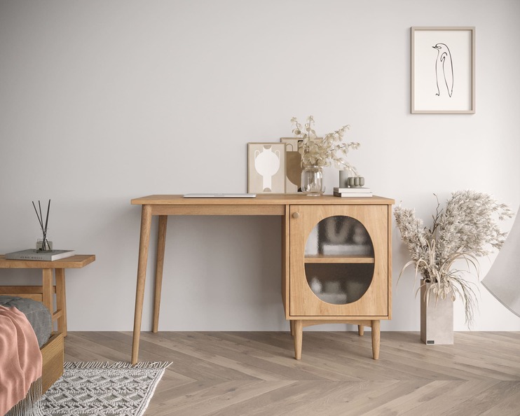 Корпуса и ящики изделий изготавливаются из ЛДСП марки Egger, ножки из массива березы, а фасады из МДФ. Все модели имеют вставки-окна из матового стекла. Мебель на высоких ножках можно не сдвигать во время уборки. Дверцы навешиваются на петлях со встроенными доводчиками для мягкого закрывания. Выдвижные ящики устанавливаются на направляющих шарикового типа.