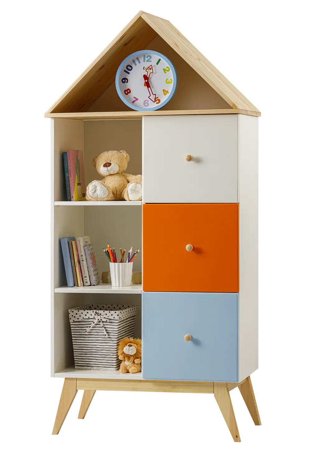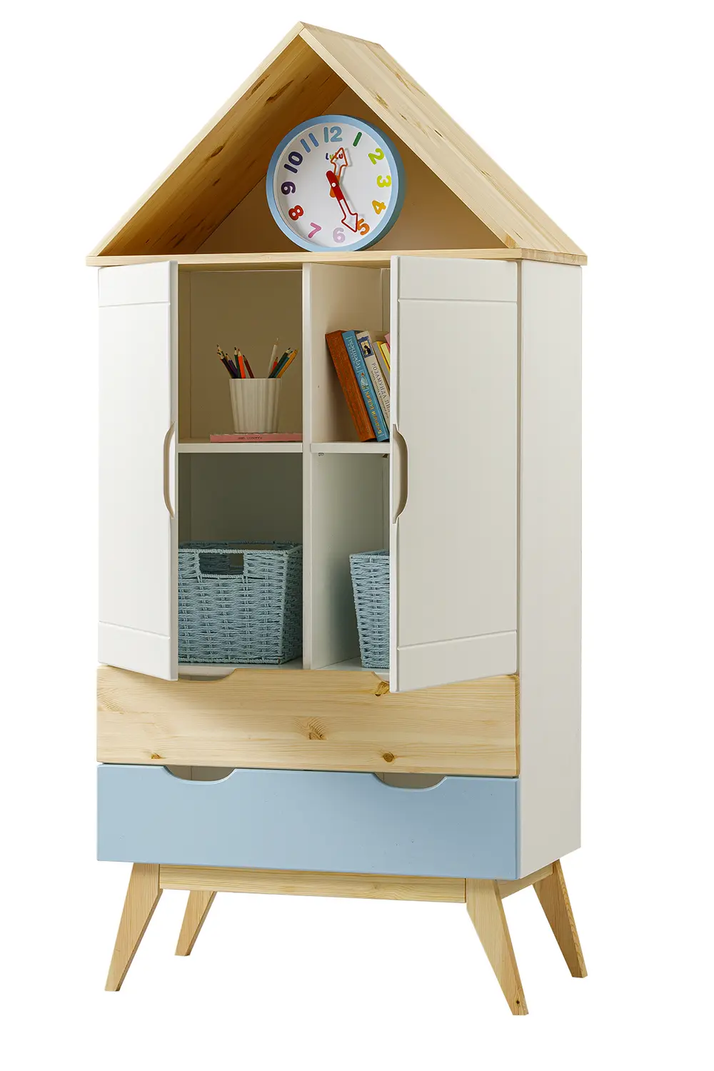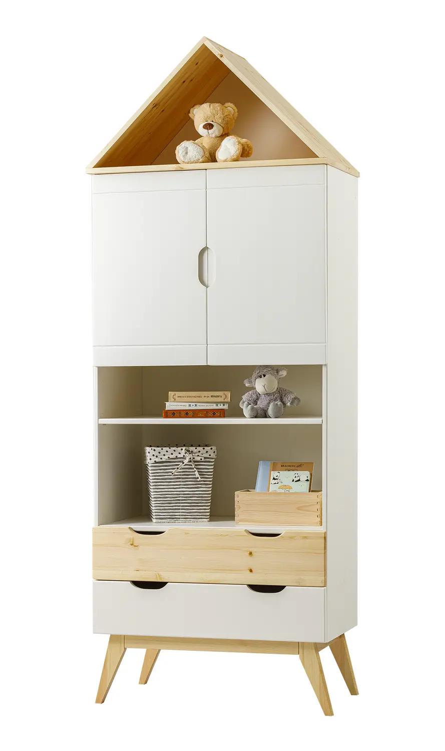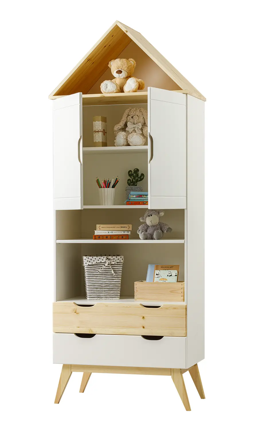 Коллекция мебели из натурального дерева включает в себя детские кровати, комоды, столы, стеллажи, шкафы и тумбы. Для изготовления корпусов и фасадов используется массив сосны, который отличается прочностью и долговечностью. Дно выдвижных ящиков и задние стенки шкафов и комодов изготавливаются из ДВП, что обеспечивает дополнительную прочность конструкции.
