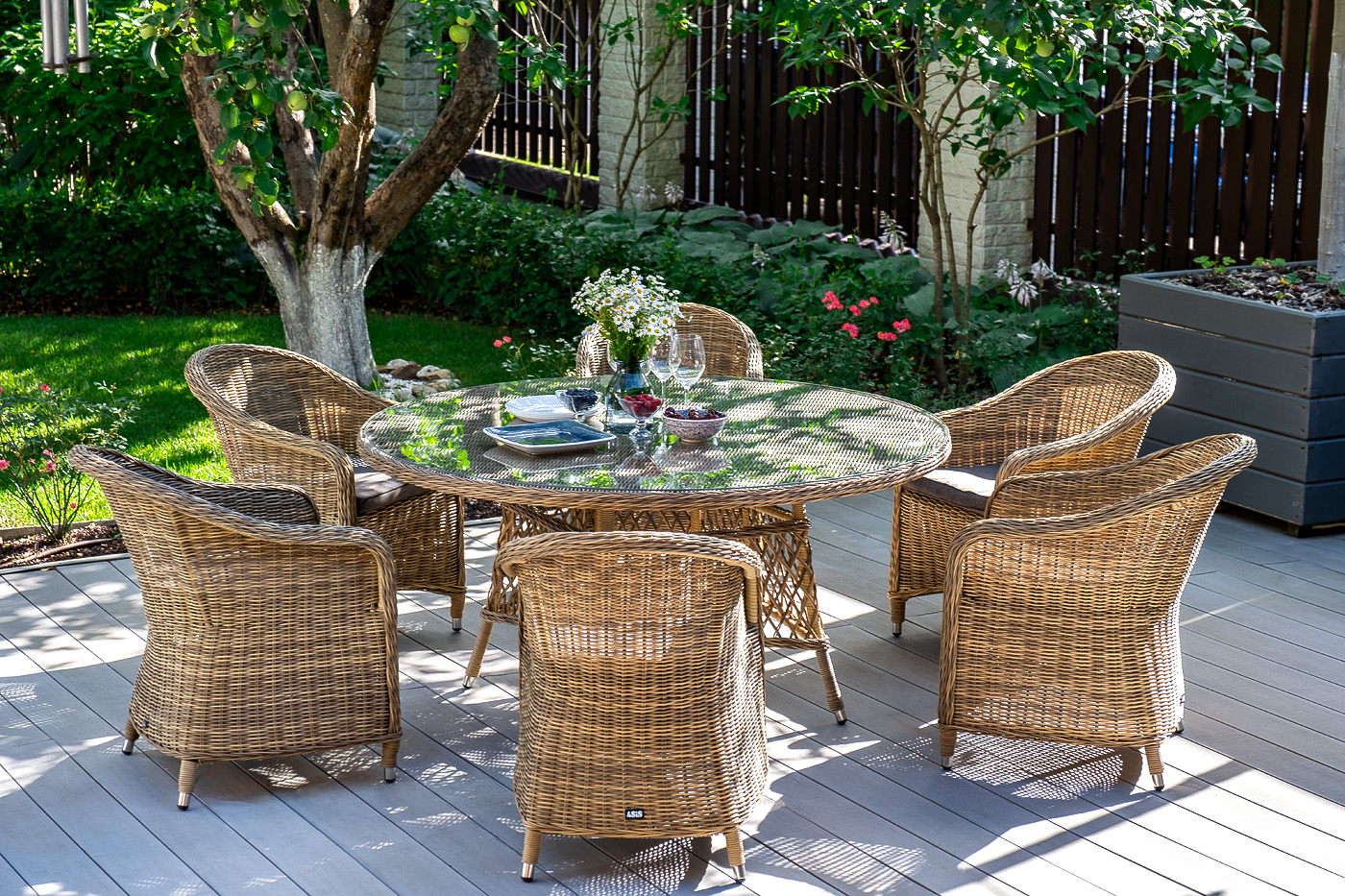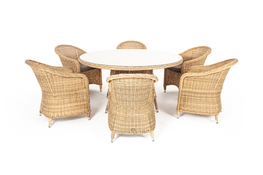 В комплект входит круглый обеденный стол «Эспреззо» (1500×1500×750 мм) с ударопрочной стеклянной столешницей и 6 кресел коллекции «Равенс» 680×570×810 мм. "Эспреззо" плетеный круглый стол, диаметр 150 см, цвет соломенный 1шт. 1 500Х1 500Х750, "Равенс" плетеное кресло из искусственного ротанга, цвет соломенный с серой подушкой 6шт. 570Х680Х810,