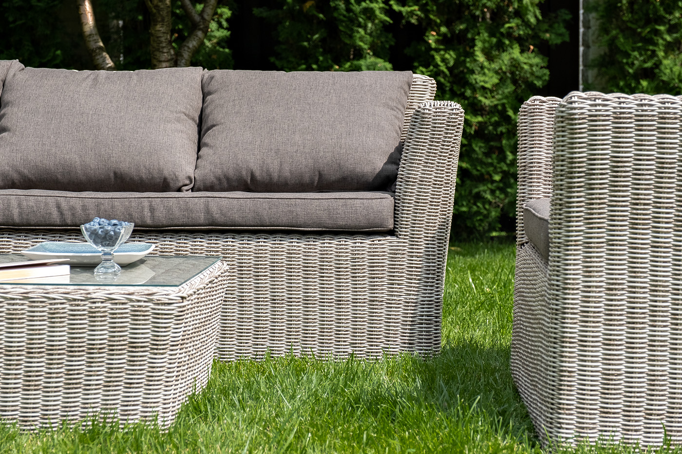 Лаунж-зона "Капуто" отличается хорошей вместительностью, поэтому подходит для комфортного отдыха компании до пяти человек. Комплект состоит из: - двух кресел (размер – 1040×865×815 мм) - журнального столика (размер – 1100×660×340 мм) - трехместного дивана (размер – 2220×865×815 мм). Из алюминия сделан устойчивый каркас мебели. Ее поверхность дополнена искусственным ротангом, из которого сделано ручное плетение, цвет бежевый. Кресла и диван идут в комплекте с подушками с серо-коричневыми чехлами. Они пошиты из качественного полиэстера с плотностью 230гр/м2. Материал предварительно проходит обработку влагоотталкивающей пропиткой. Столик дополнен практичной столешницей из стекла толщиной 5 мм. "Капуто" диван из искусственного ротанга трехместный, цвет бежевый 1шт. 2 220Х865Х815, "Капуто" кресло из искусственного ротанга, цвет бежевый 2шт. 1 040Х865Х815, "Капуто" журнальный столик из искусственного ротанга, цвет бежевый 1шт. 1 100Х660Х340,