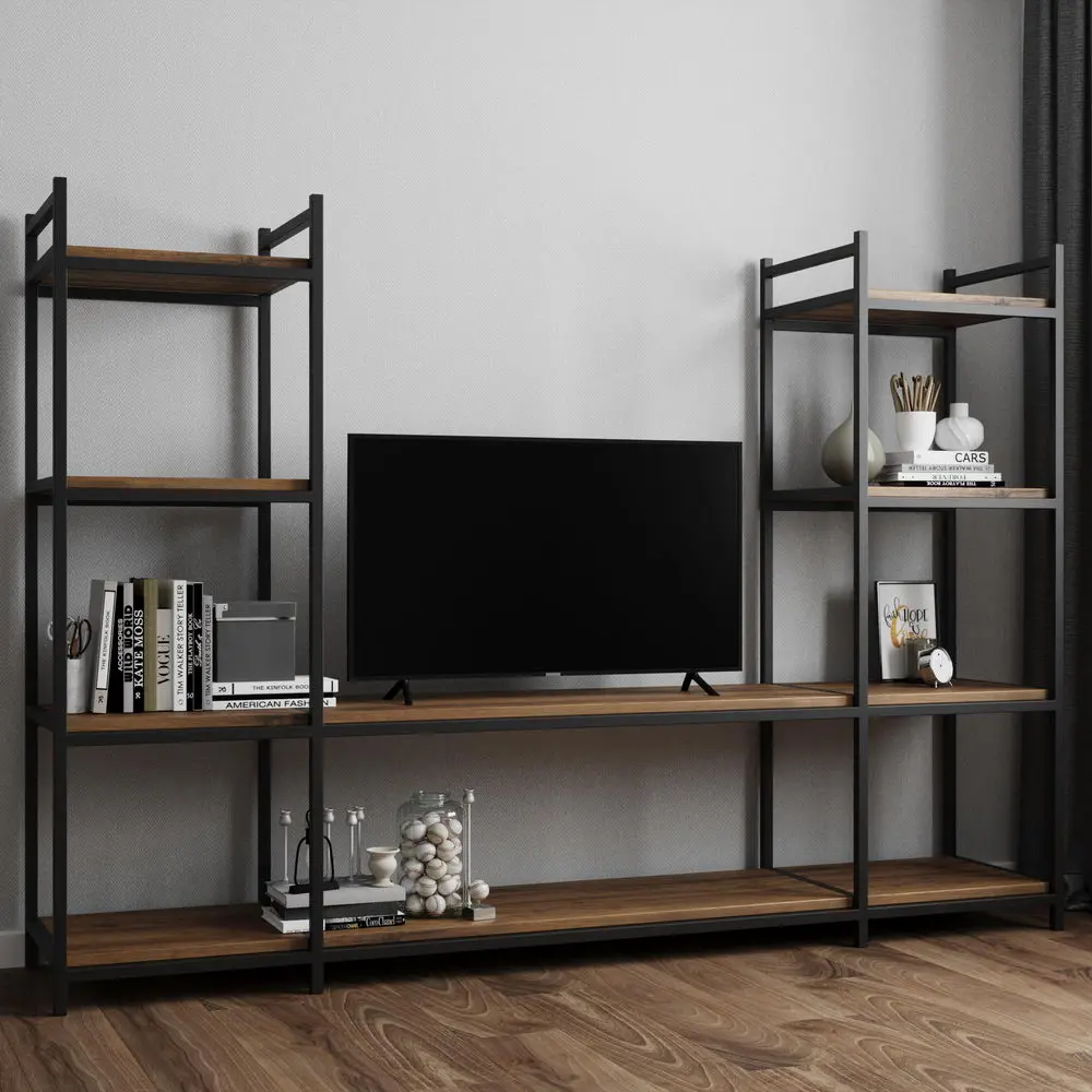 В мебели для гостиной «Лофт» металлические каркасы удачно сочетаются с корпусами и фасадами из натурального дерева. В коллекцию входят обеденные столы, журнальные столики, тумбы ТВ, стеллажи с открытыми полками, консоли, скамьи с мягкими сиденьями.