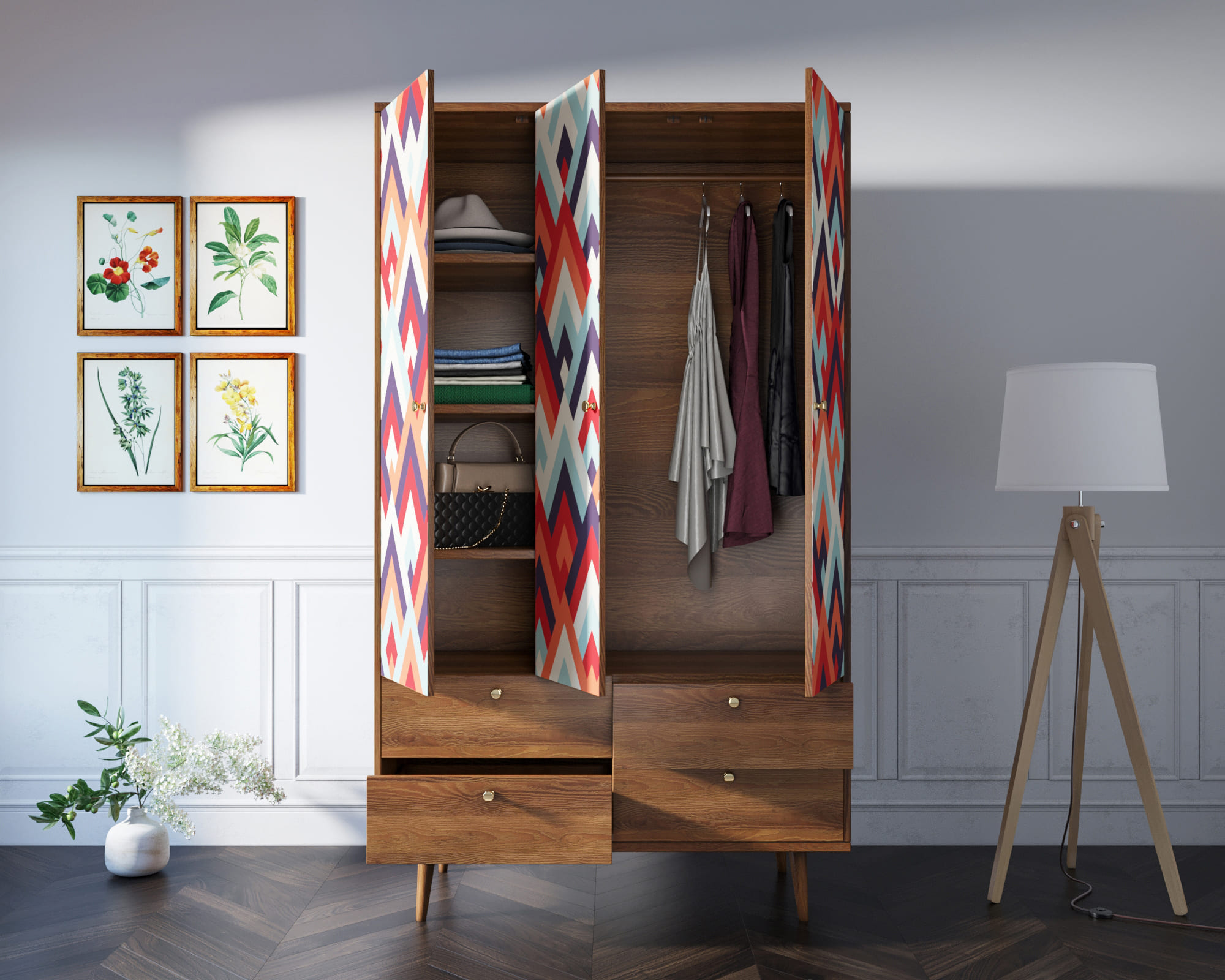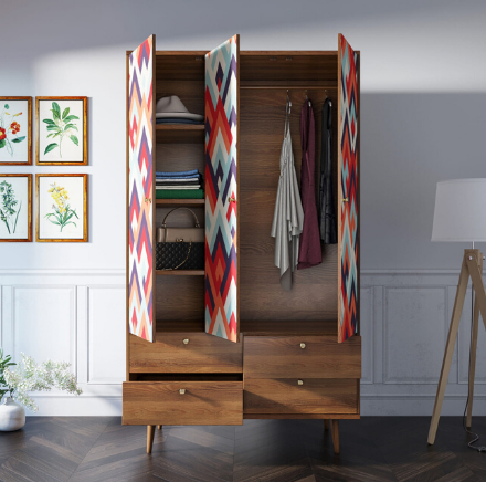 Корпус и ящики изготавливаются из ЛДСП австрийской компании "EGGER". Ножки мы делаем из массива ясеня и крепим на стальную пластину, на дверях петли с доводчиком а на ящиках шариковые направляющие. Принт на фасады наносится принтером специальными УФ - чернилами.