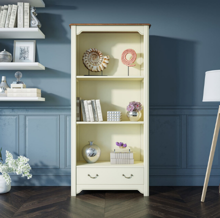 Наполнение стеллажа: две открытые полки и ниже 1 выдвижной ящик.
