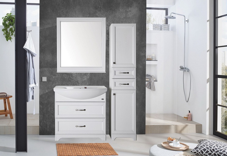Коллекция «Берта» для ванных комнат включает в себя пенал с распашными дверцами и выдвижными ящиками, тумбу с дверцами и ящиком, керамическую раковину и зеркало в двух вариантах – с боковым шкафчиком или без шкафчика.