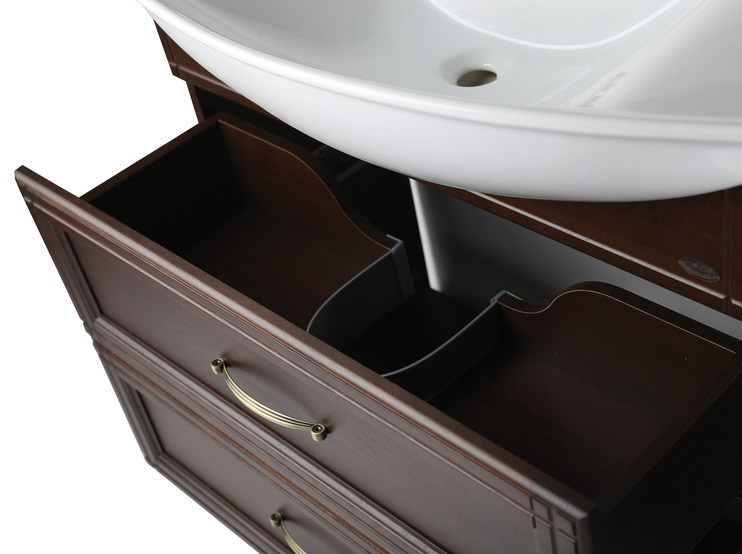 Дверцы и ящики оснащены доводчиками и направляющими европейского производства, открываются и выдвигаются мягко и бесшумно. Фасады изготавливаются из натурального долговечного материала – массива ясеня, покрываются матовым лаком. Для изготовления корпусов, полок и стенок ящиков используется МДФ. Задние стенки и днища ящиков делают из ДВП. Ручки имеют влагостойкое матовое покрытие.